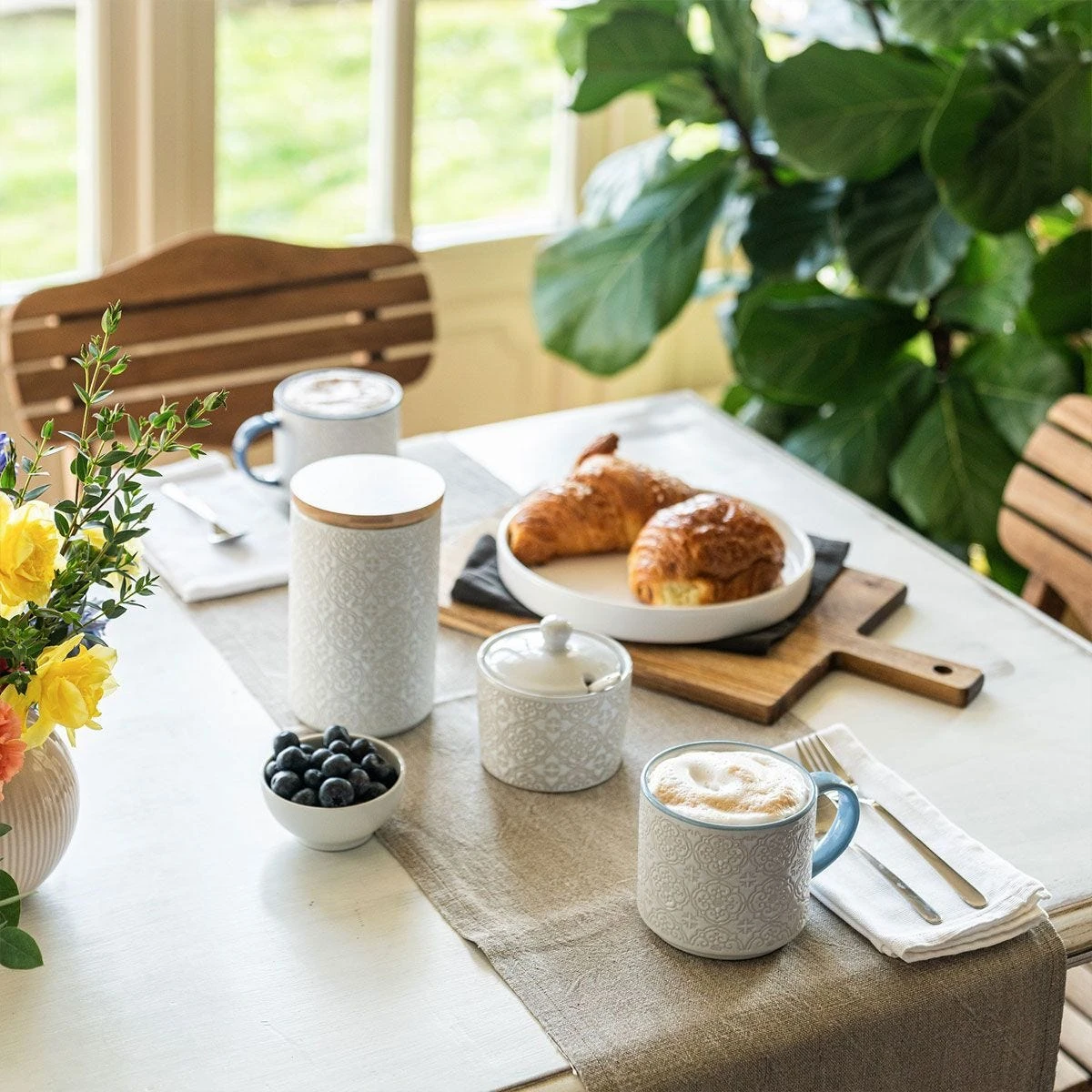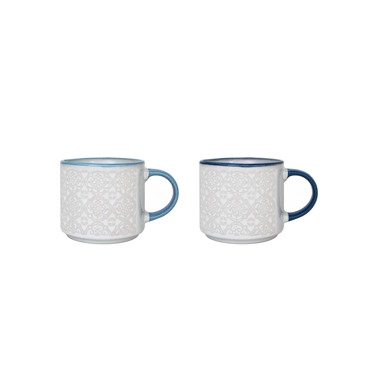 Il set da 2 mug impilabili è la soluzione perfetta per gustare in coppia un caffelatte o un caffè lungo. Il decoro in rilievo rievoca le trame delle tradizionali maioliche; un tocco di eleganza e originalità per la tua tavola e la tua cucina.