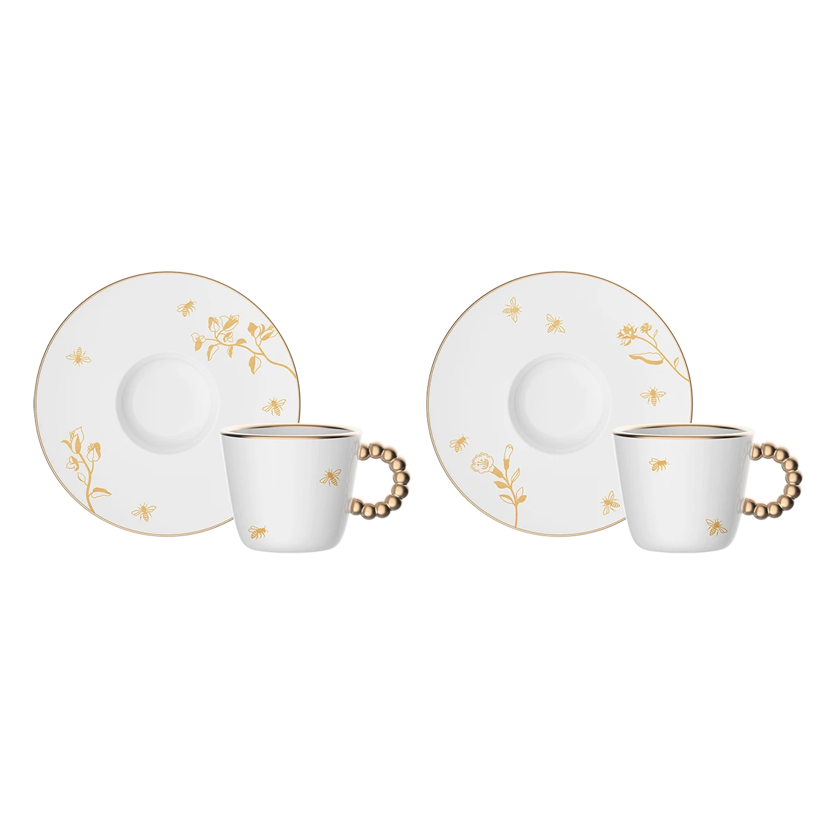 Il set due tazzine Perle unisce la raffinatezza del manico a perle alla finezza del decoro delle api. L’oro e il bianco completano questo design ricercato.